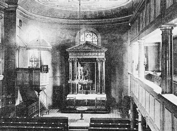 Der unten abgebildete Entwurf entspricht nicht ganz dem heutigen Bild der Auferstehungskirche: der Turm zeigt sich hier nur 2- statt 3-geschossig und die Sakristei fehlt noch gänzlich.