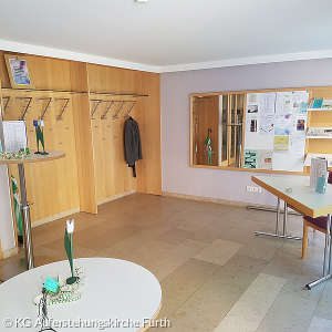 Im Erdgeschoss befindet sich das Foyer mit Garderobe, der Gemeindesaal und die Küche.
